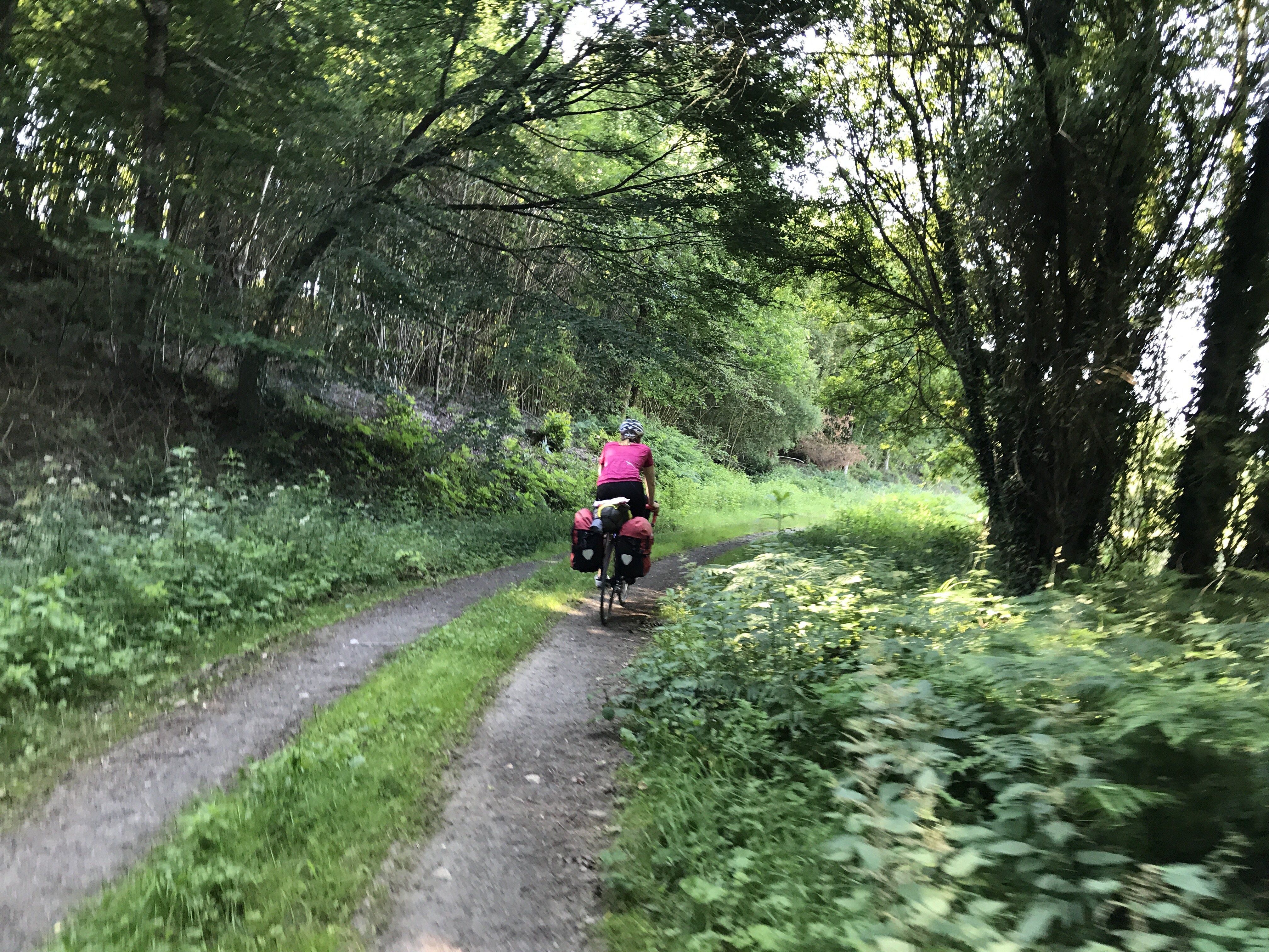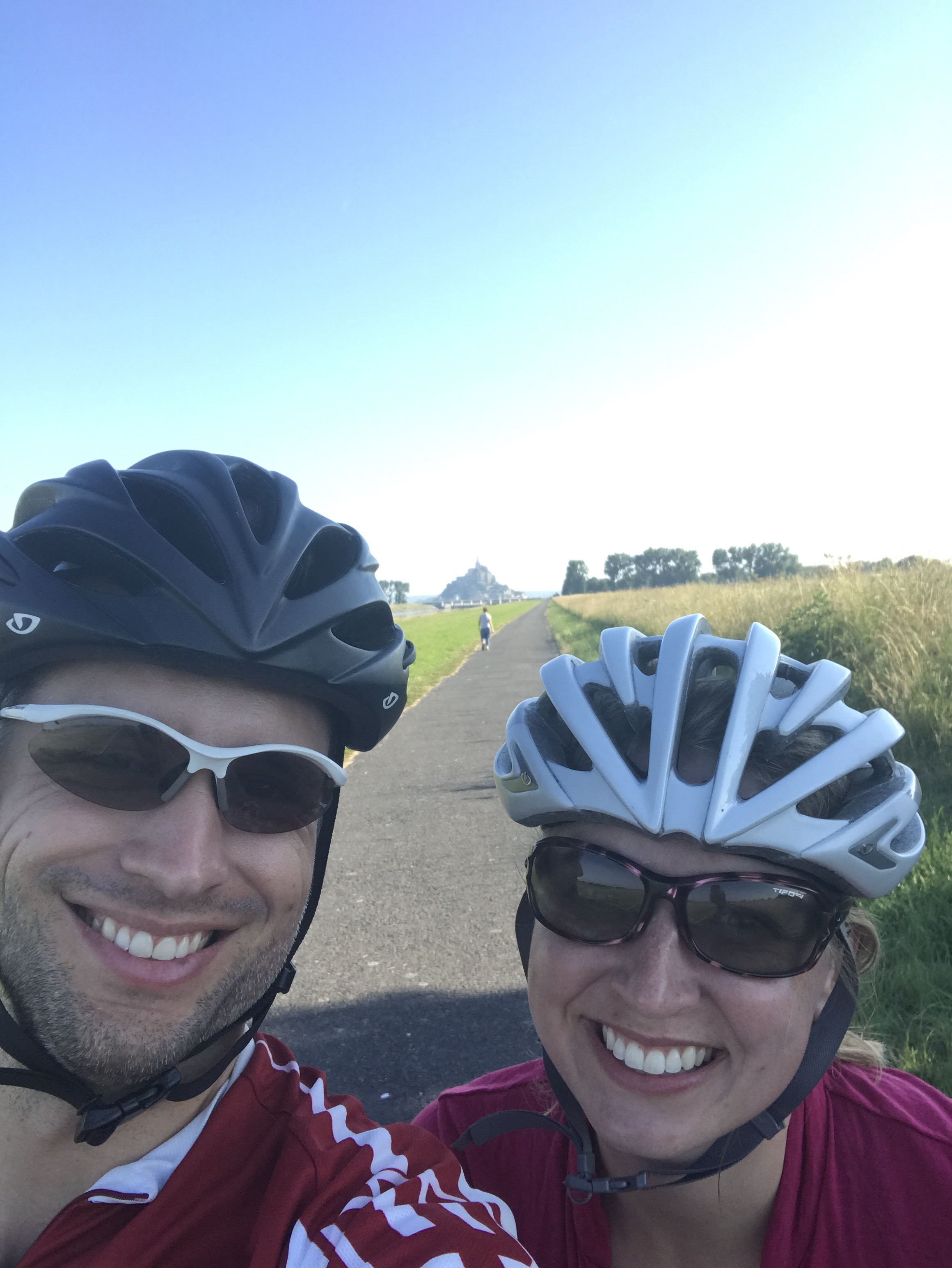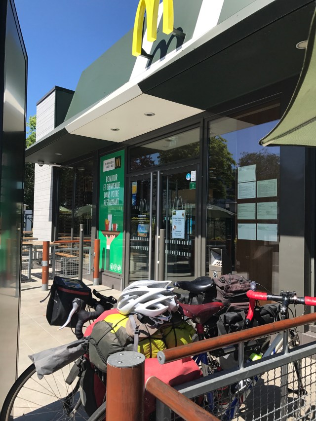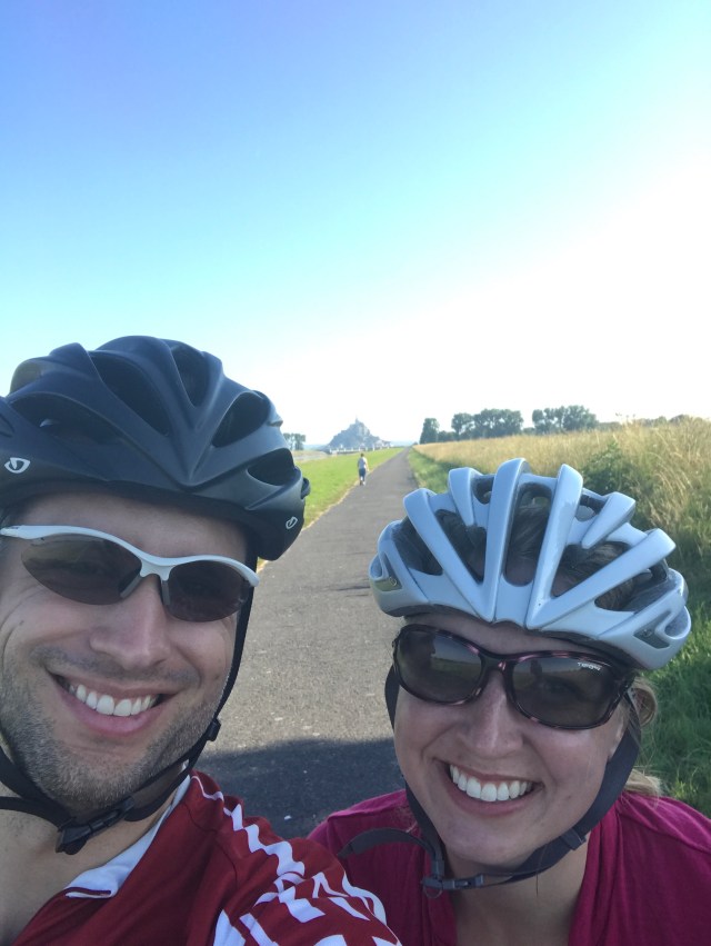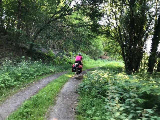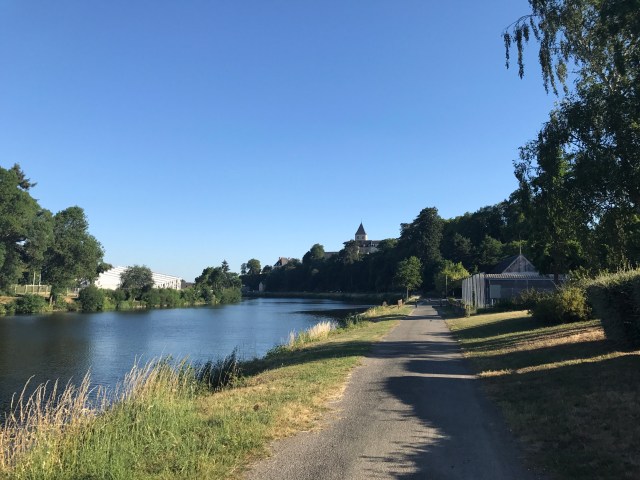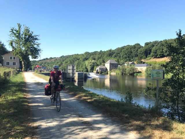 The ride today was 147km from Mont Saint Michel to a town we picked on a whim (and with the help of Airbnb) – Chateau-Grontier. We were a bit sad to leave Mont St Michel but surprised to find another long, sign-posted bike path encompassing probably 80% of our desired route. The ride out of town followed a small river and later through small towns on back roads. The 20% of path not following a sign-posted route was brought to us by the wonderful Google Bike Route algorithm which often mistakes a seldom-traversed farm road for a bike path (see picture below – this one is actually in decent shape).