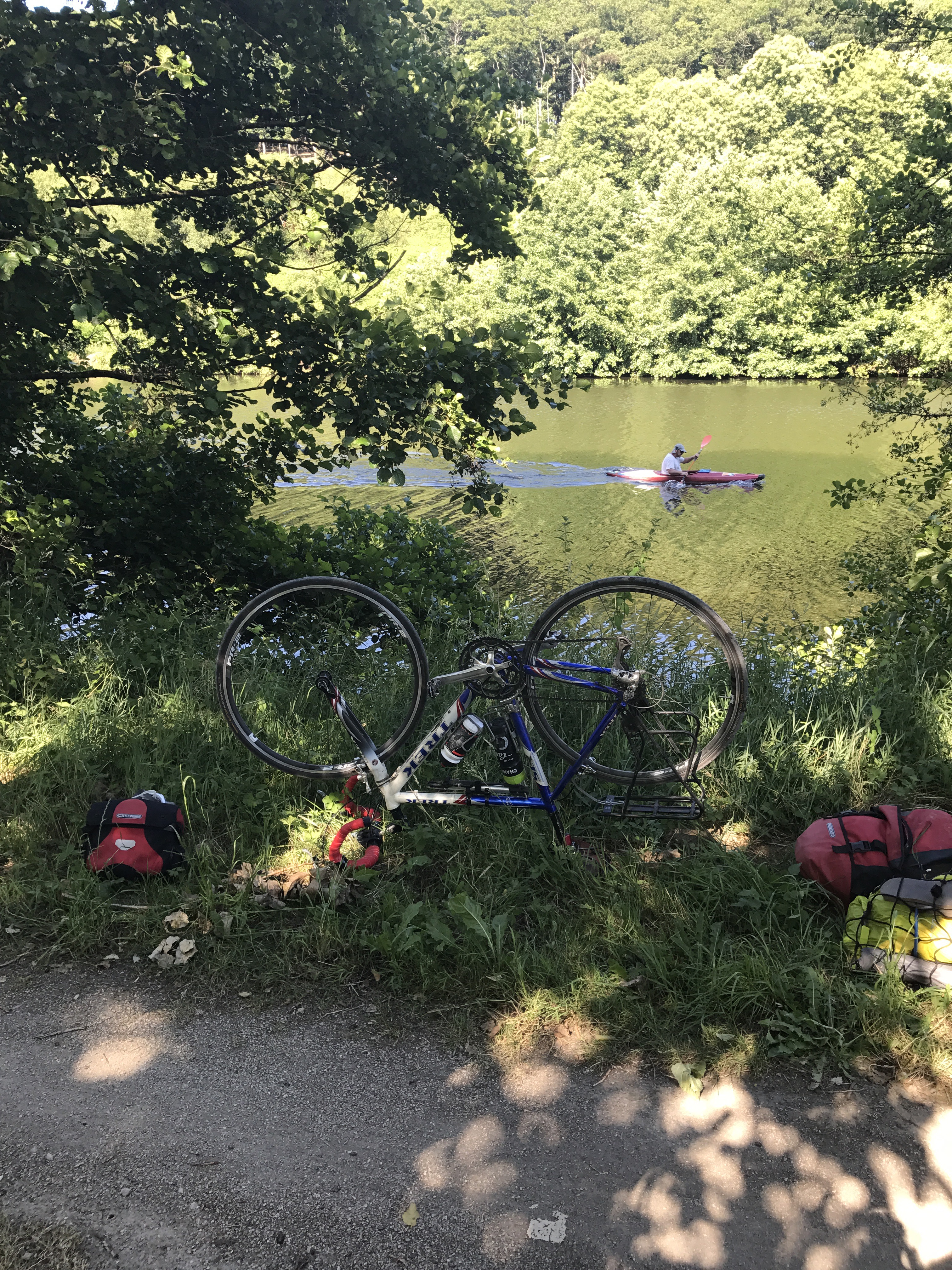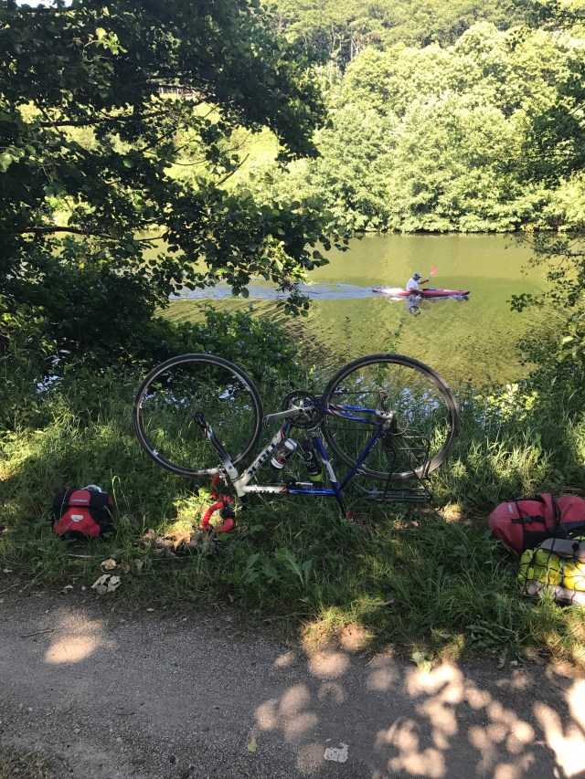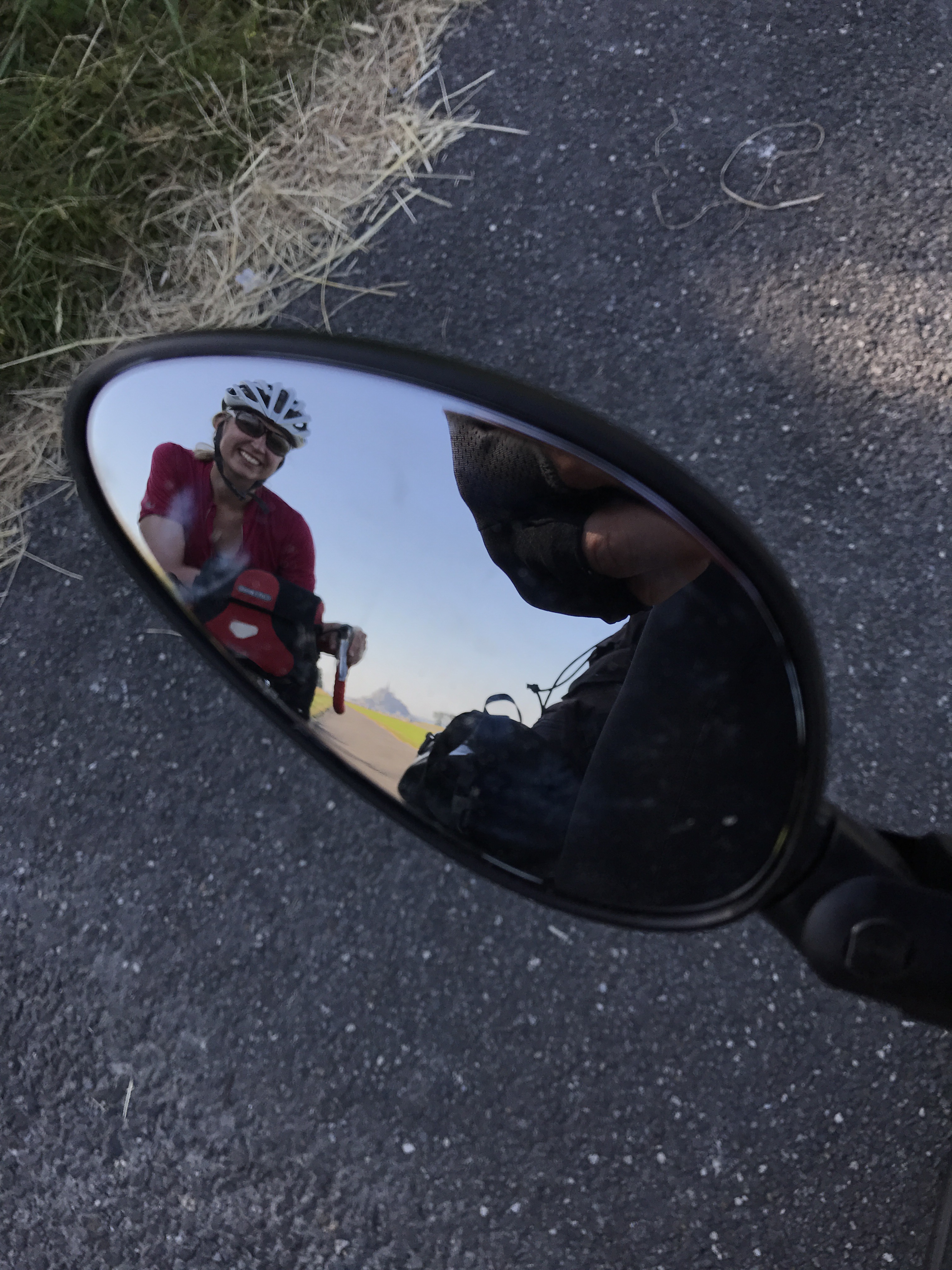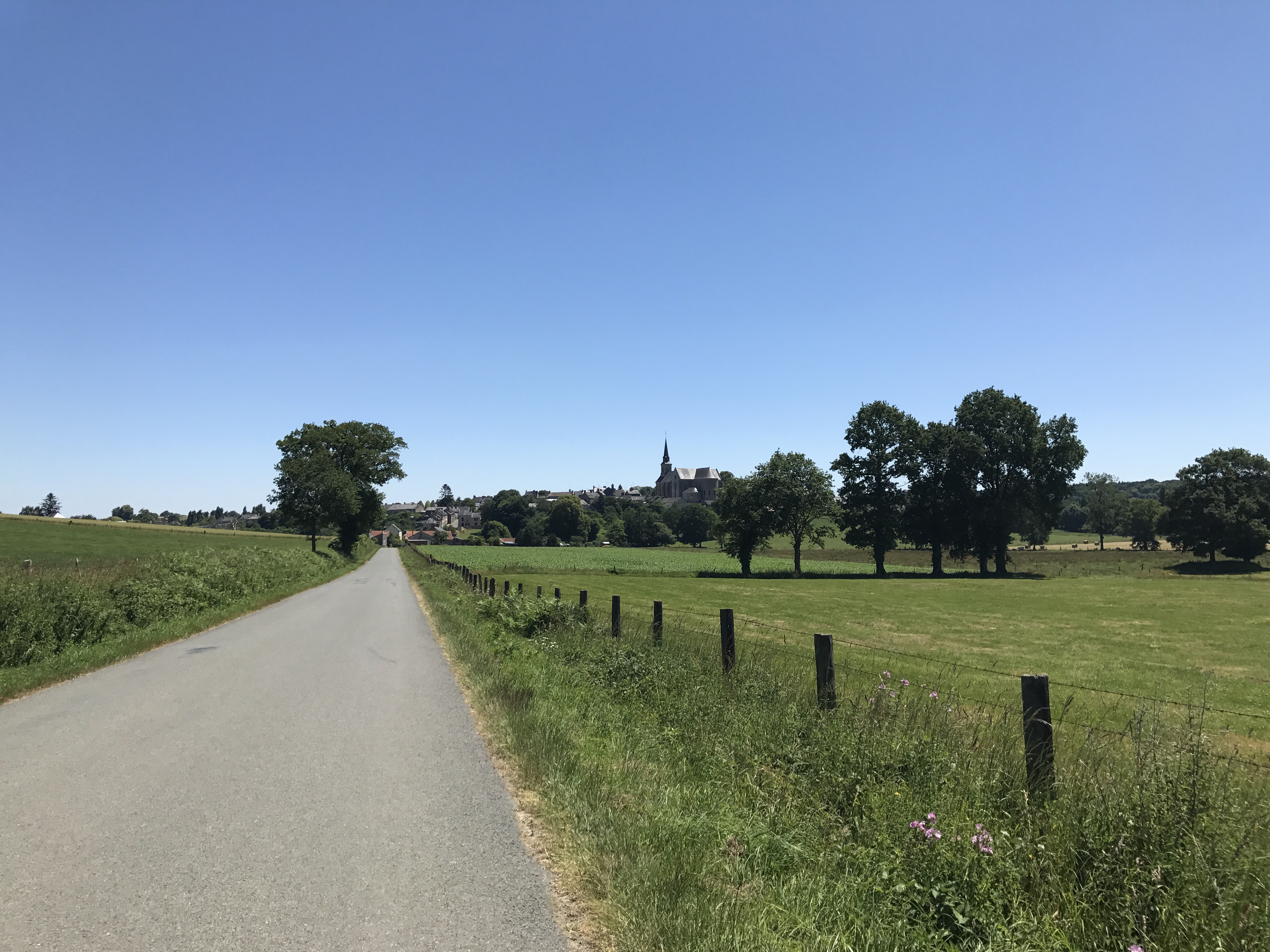 The ride today was 147km from Mont Saint Michel to a town we picked on a whim (and with the help of Airbnb) – Chateau-Grontier. We were a bit sad to leave Mont St Michel but surprised to find another long, sign-posted bike path encompassing probably 80% of our desired route. The ride out of town followed a small river and later through small towns on back roads. The 20% of path not following a sign-posted route was brought to us by the wonderful Google Bike Route algorithm which often mistakes a seldom-traversed farm road for a bike path (see picture below – this one is actually in decent shape).
