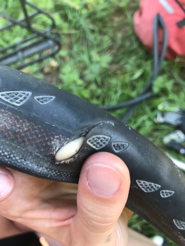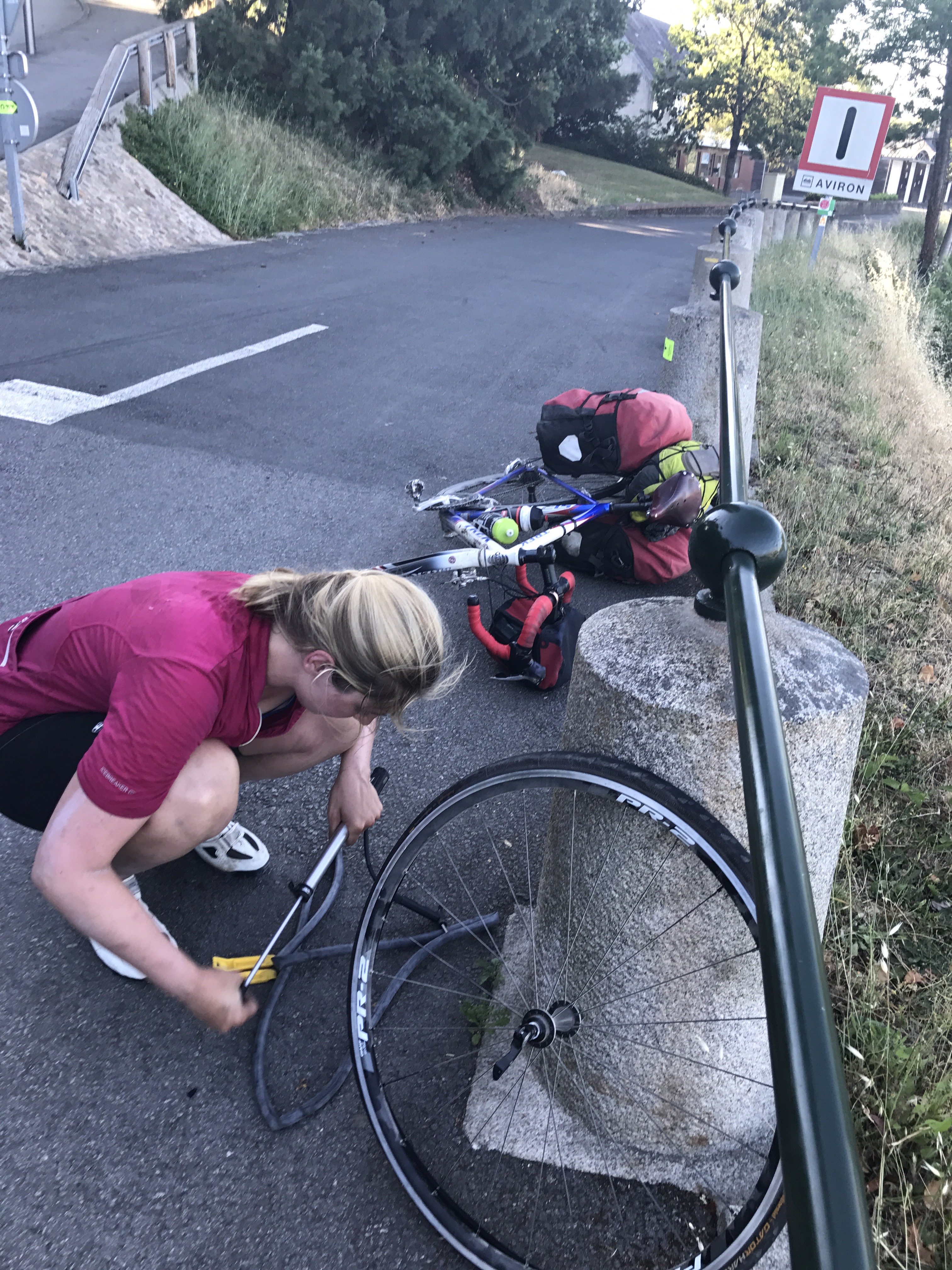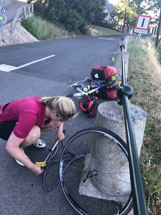 We really enjoyed the bike scene and had a great time continuing along the Mayenne. That is, until Caitlin’s rear tire decided to have another issue and ripped open a huge gash. Luckily it was in a picturesque spot. We used a 5 Euro bill to plug the tire and replaced the tube. We were 1.5km away from the Airbnb when her front tire wanted in on the fun, and also got a flat! Fortunately it was just a tube (and not tire) issue but still not the best timing. Again, though, we had a great view of our destination town which turned out to be a really beautiful place.