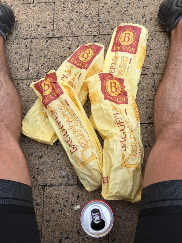 Caitlin’s new tire clearly wasn’t as good of quality as the originals, so she had a flat tire after 10-20km of riding. After that, we managed to find a great Boulangerie/Patisserie in a small town along the way and bought a few things from the local market. We then had a short, but hot, ride to our hotel.