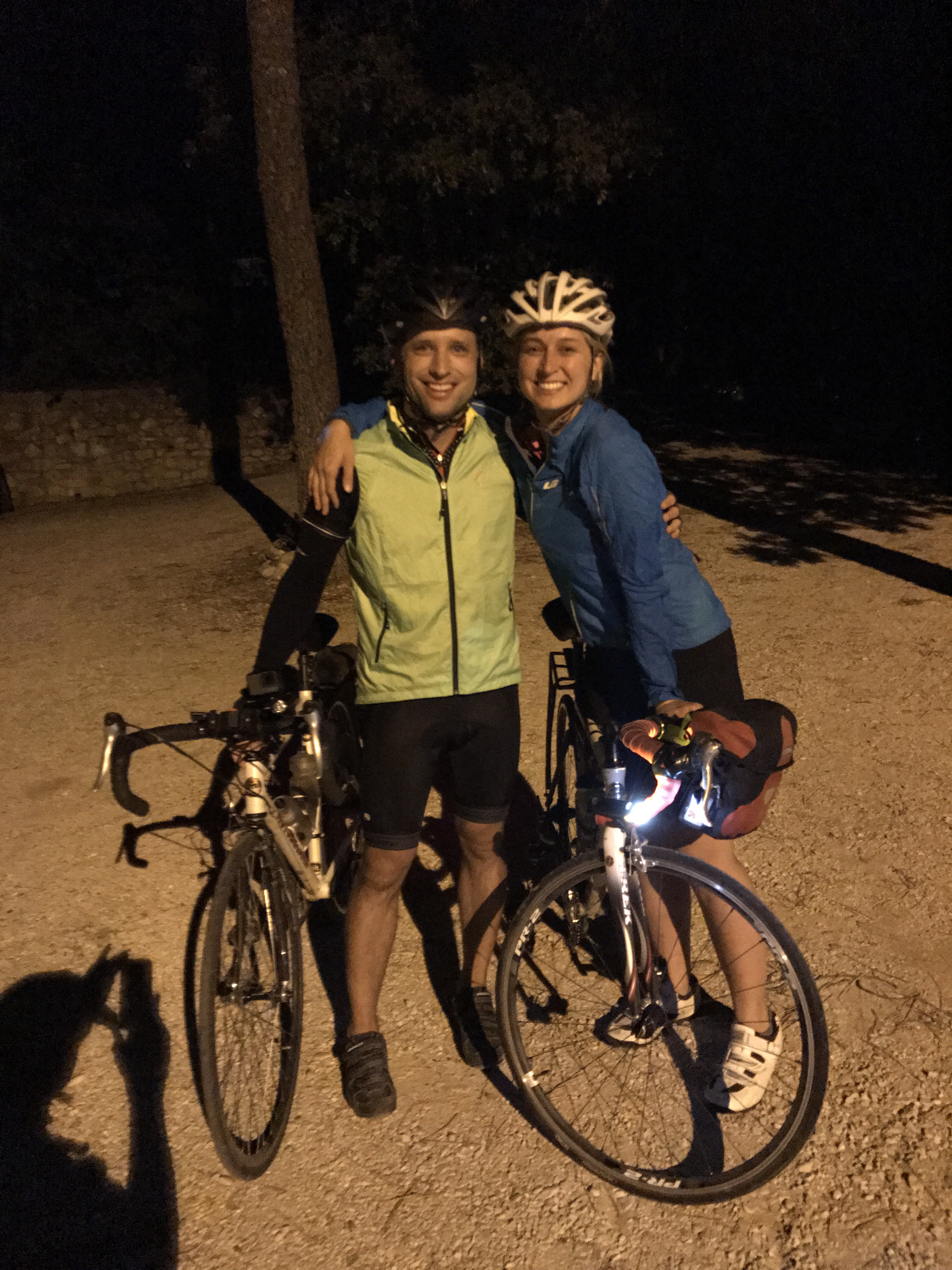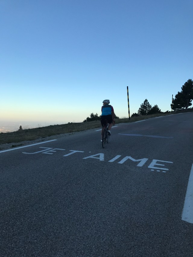 Never has cresting a mountain felt more joyous! We were wrecked but it was so tremendous to have done it! The descent to Bedoin (which we climbed in the dark) was downright celebratory! It was absolutely gorgeous with the golden-hour light streaming thought the forest and then lighting up the vineyards that cover the bottom third of the mountain. It was crazy fast and fun! With the grade being what it is and literally only one switchback, it’s a blur of flowing speed.