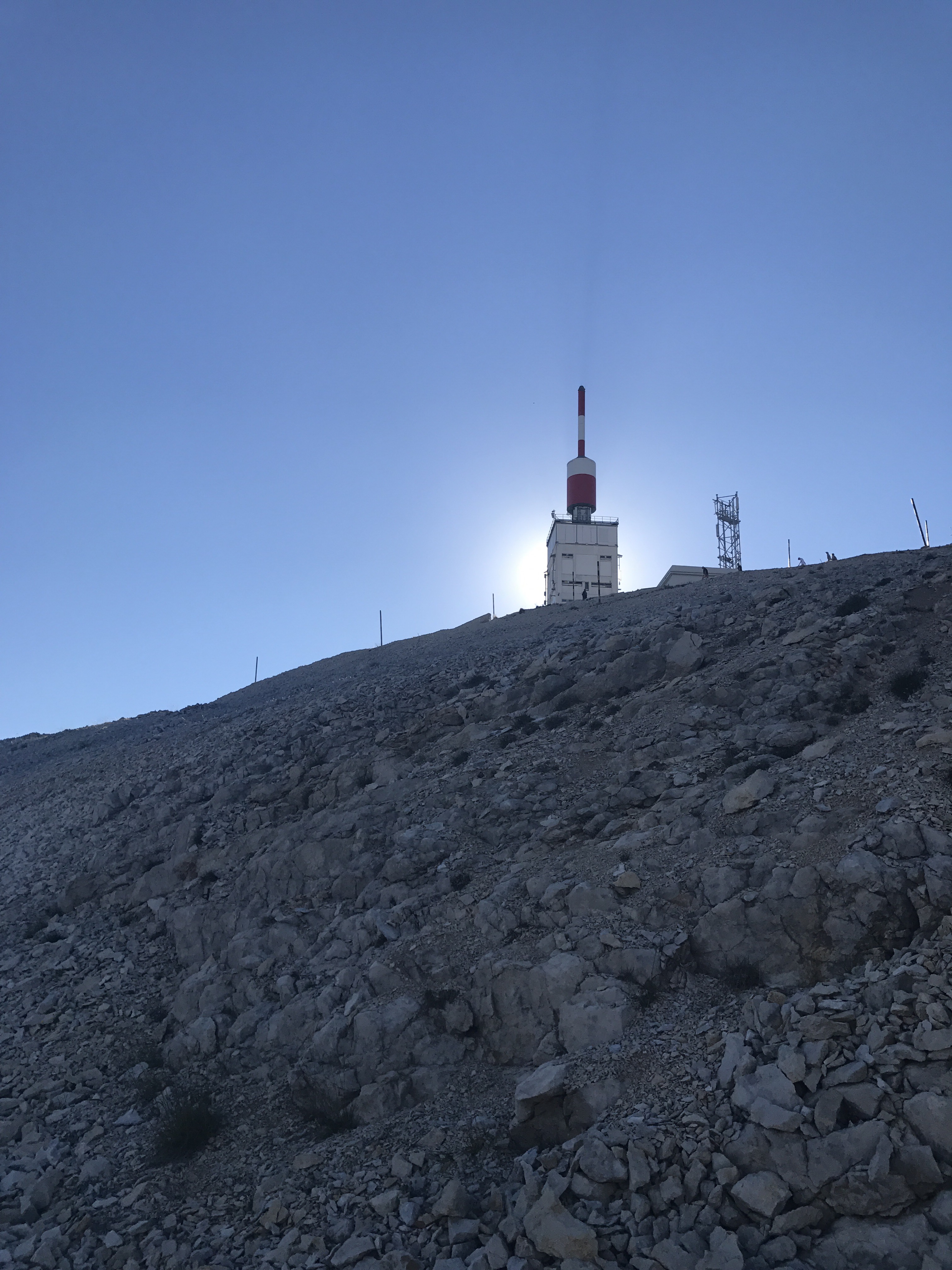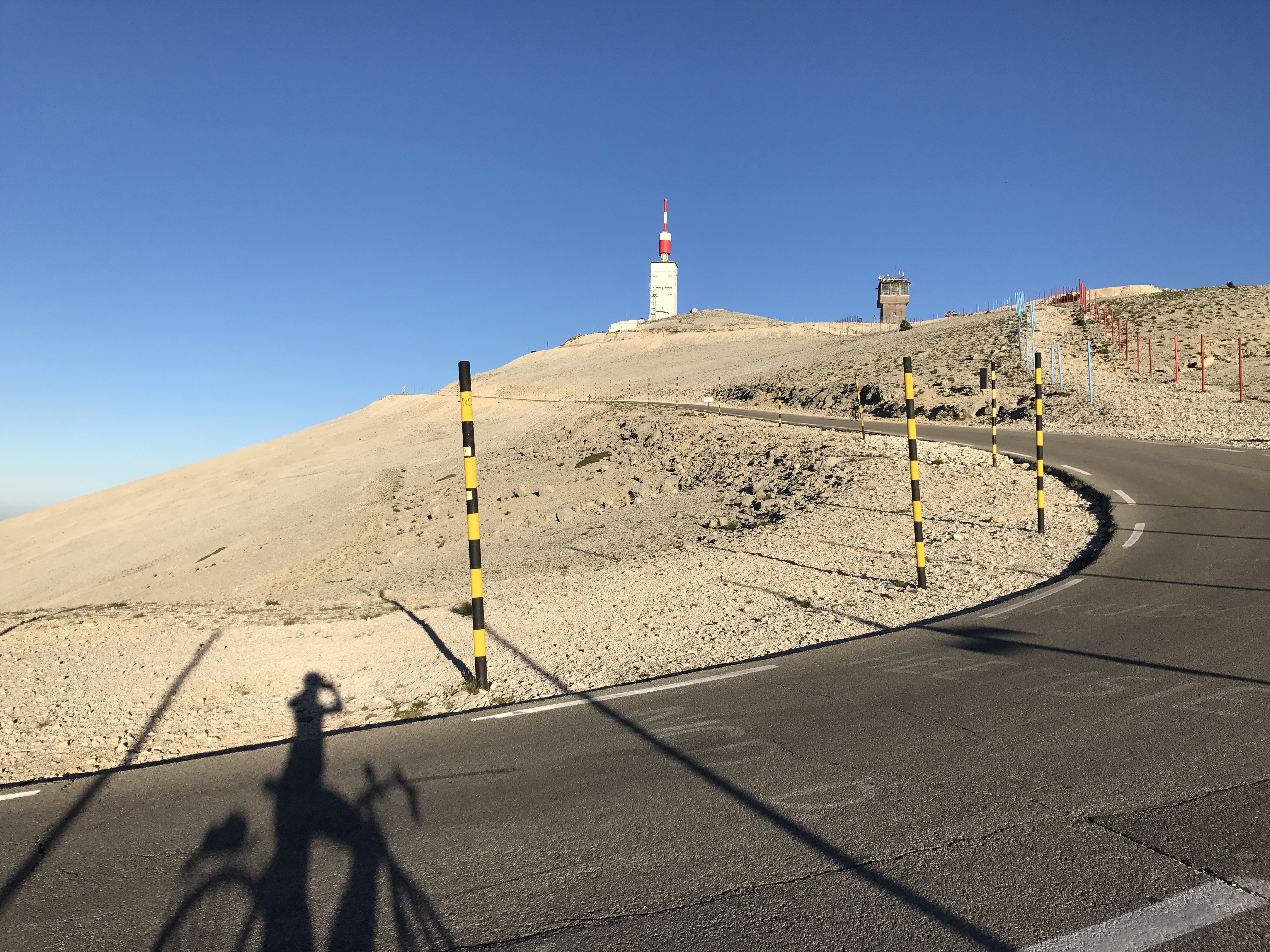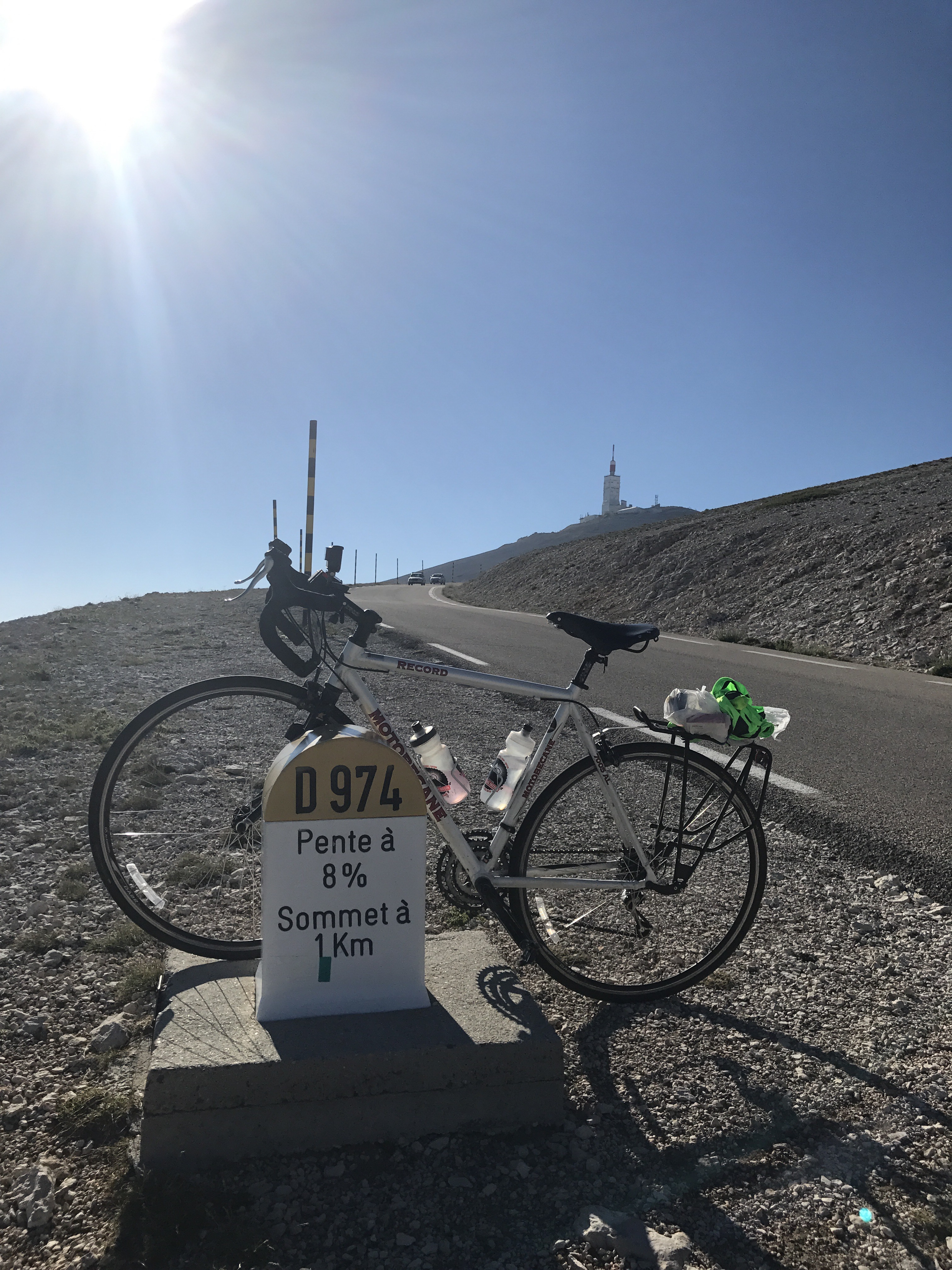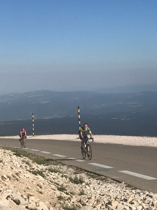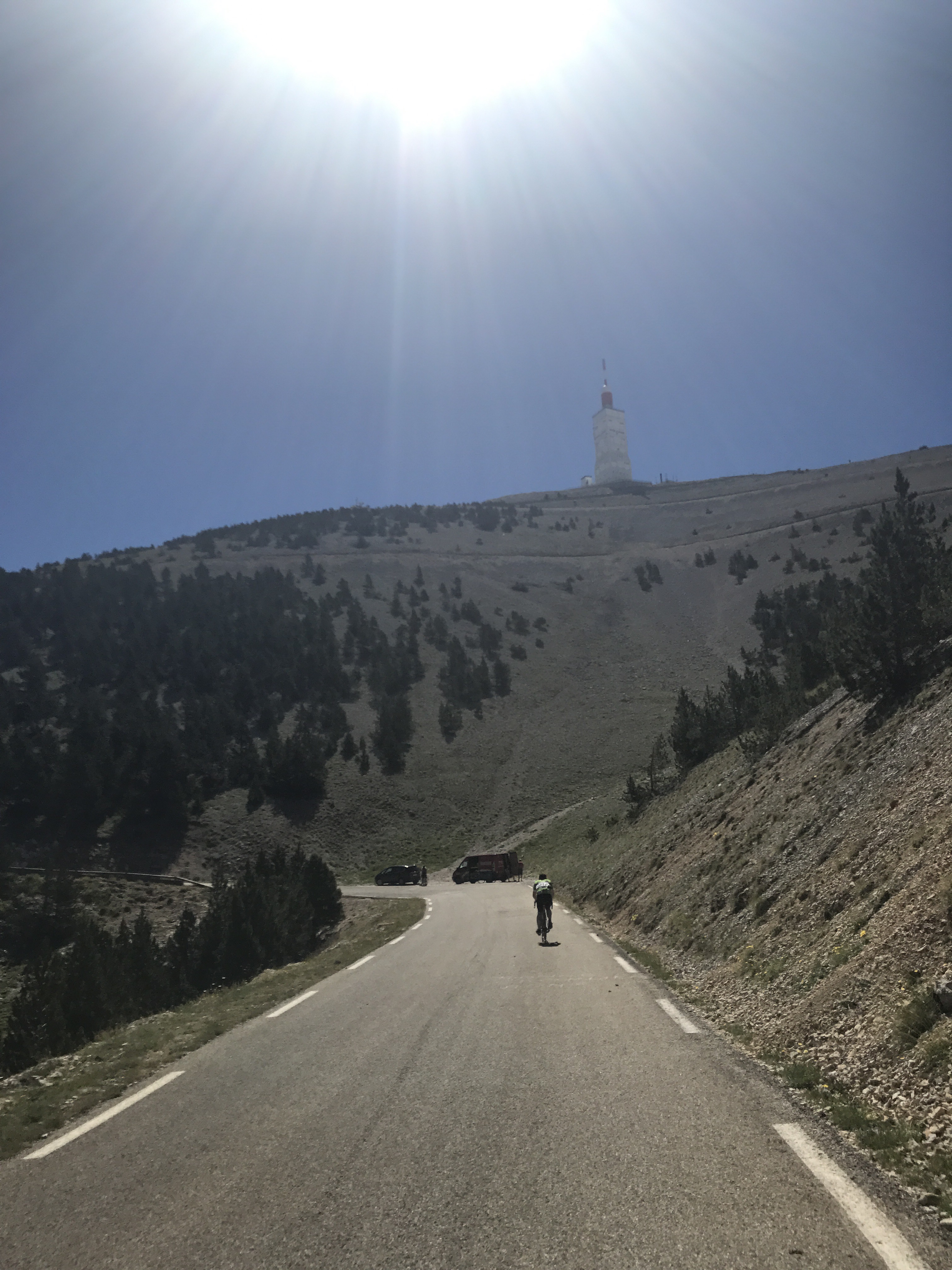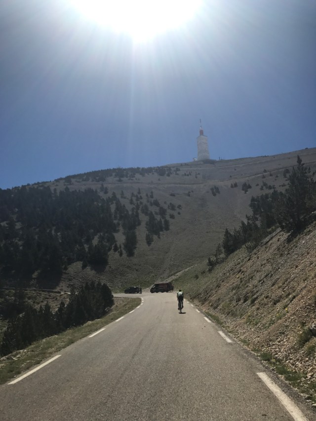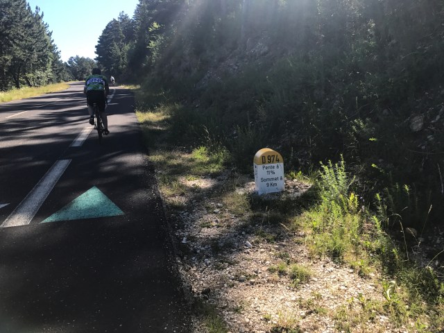 At 8:50 we turned our rigs around to head back up the mountain. It was already getting very hot and we had to take some breaks to cool off. This second ascent is still difficult with lots of sections of 11% average grade, but unlike the ascent from Bedoin, it’s broken up by hairpins and relatively milder sections.