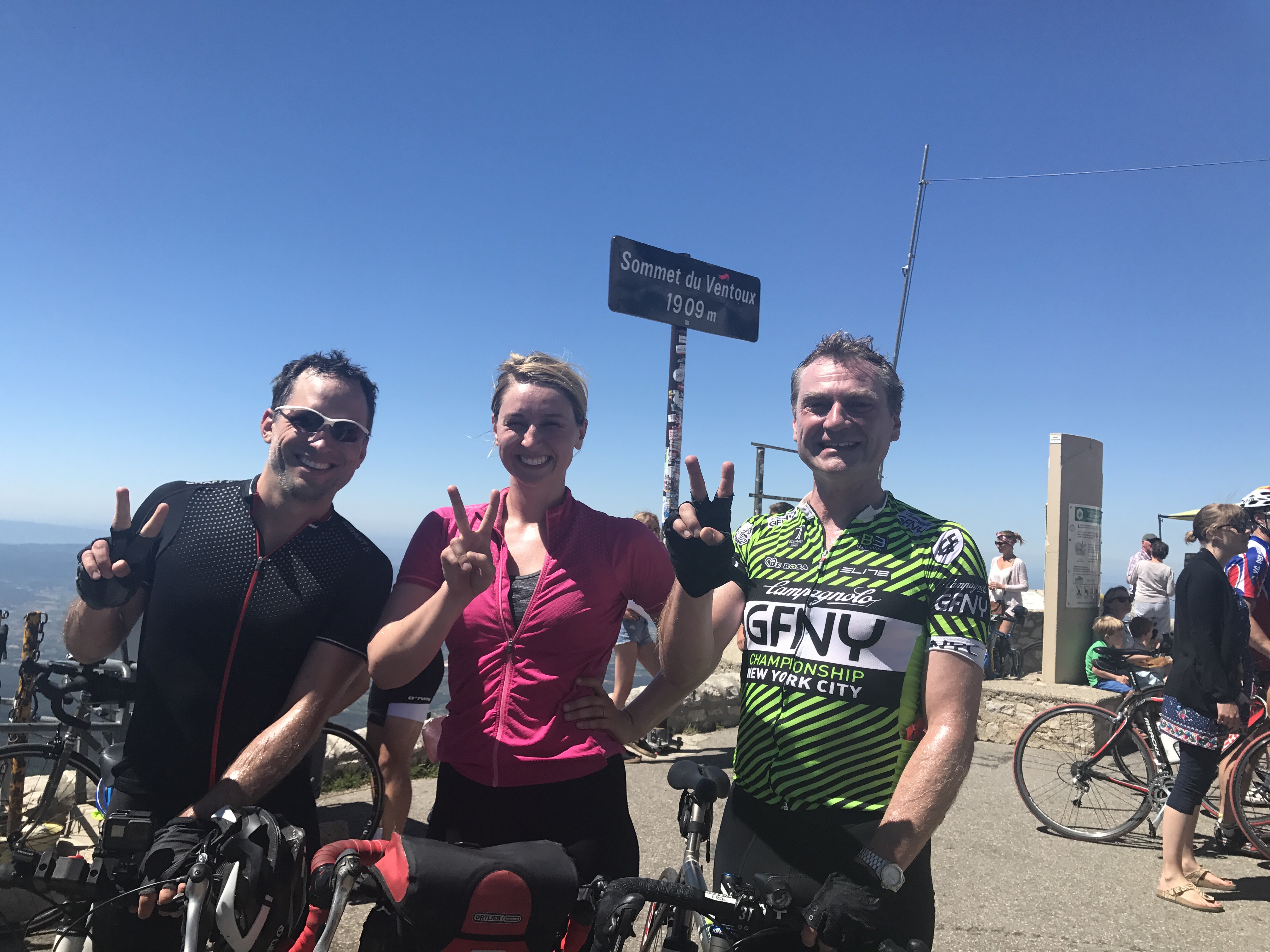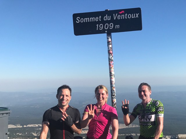 We joined a special group of fool hardy cyclists, Club des Cinglés du Mont-Ventoux. It translates to the crazies club and is reserved for those who climb Ventoux three times in one day. The feat requires 137km/85mi and 4,400m/14,435ft of vertical climbing between the three ascents. It was without a doubt one of the hardest days on the bike for all of us, but it was a blast and the suffering was well worth the adventure, descents and incredible views. (Also we get medals!)