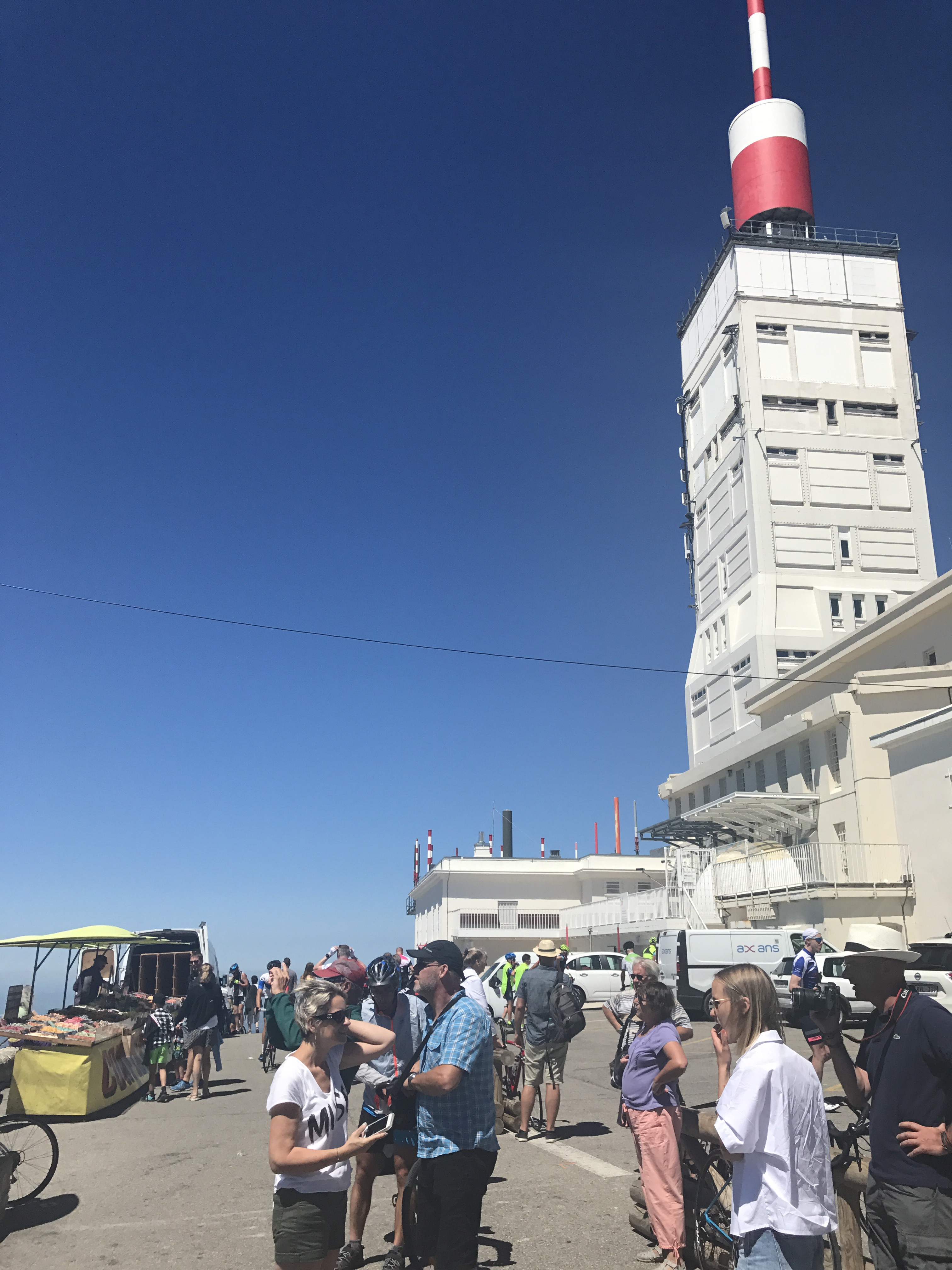We summitted at 12:05 to a biking CARNIVAL on top of the moutain. It was really quite a scene with all the kit colors on hundreds of cyclists, not to mention all the other tourists. That was a ton of fun to see the mountain revel in its status as a biking pilgrimage.