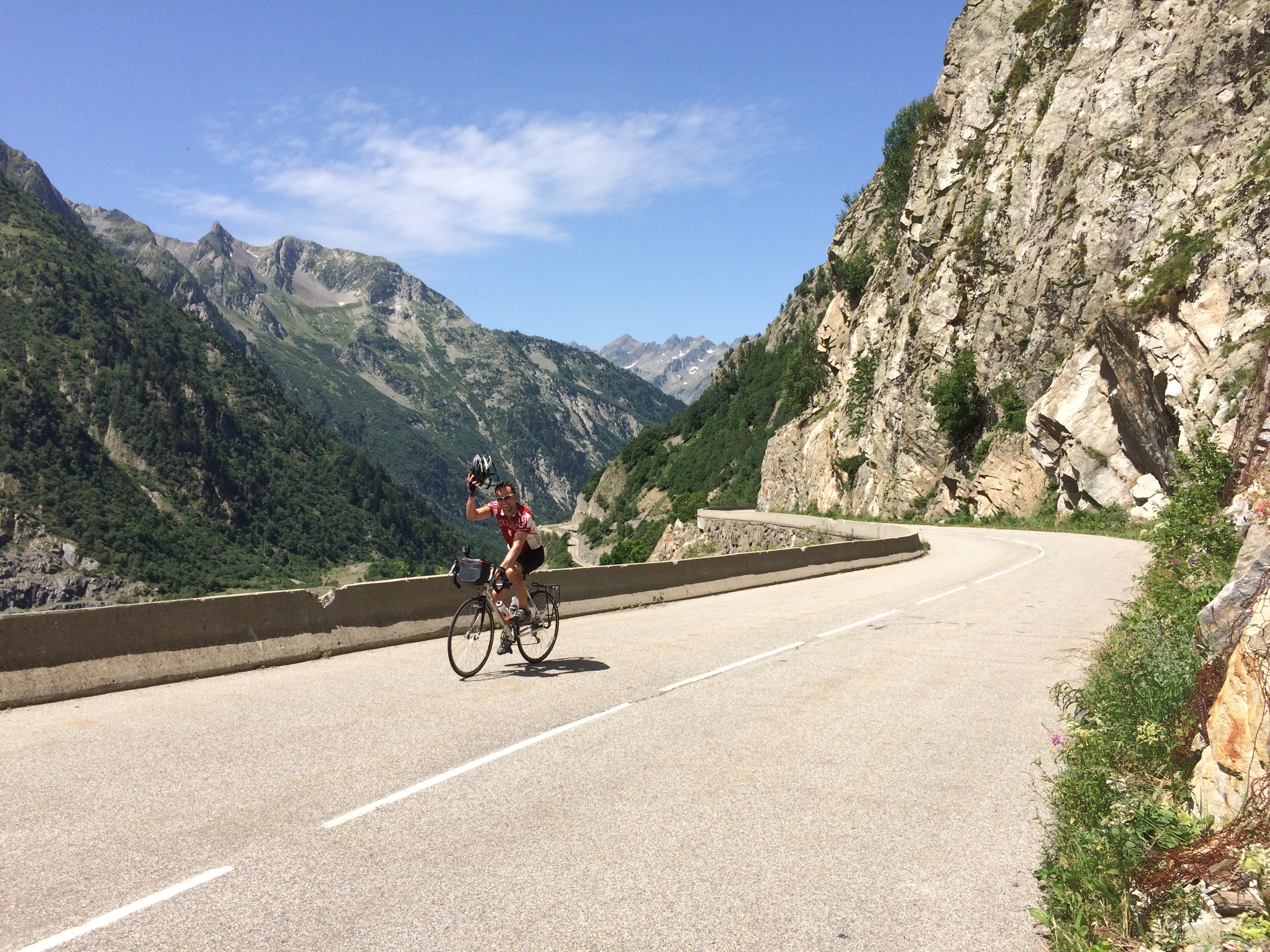 Soon after it’s dawning on us that we have a big climb ahead of us, Rick surprises us in his car and tells us of elevation gradients that average to 11% for a km ahead. He takes pity on us and takes our heavy bags to the other side of the brutal section. We’re not sure we would have made it otherwise! We also had help from a Trek Cycling tour guide who gave us ice-cold water from their support van and provided encouragement. Huge help as well. It’s funny how quickly company tour guides associate with touring cyclists and go out of their way to help.