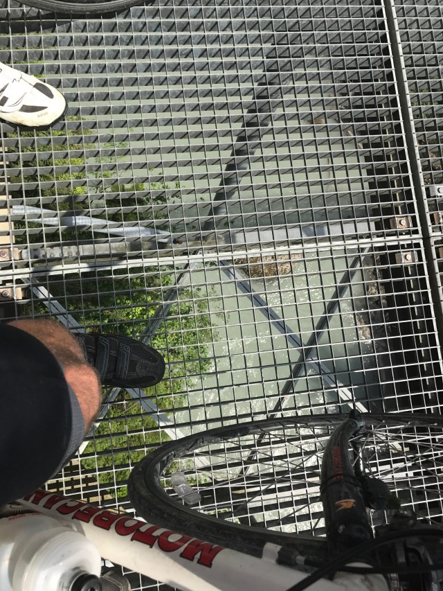 Leaving Bern, we went through a city park along the river, then found ourselves in Swiss farmland. The bike route was mostly on quiet farm roads or gravel park roads. As we approached Lake Thunersee, we suddenly were on a grated bridge hundreds of feet in the air above a river. It was pretty nerve wracking staring down as we pedaled, as we could see the bottom with very little obstruction. We took a few pictures and videos – then got off the bridge as quickly as we could.
