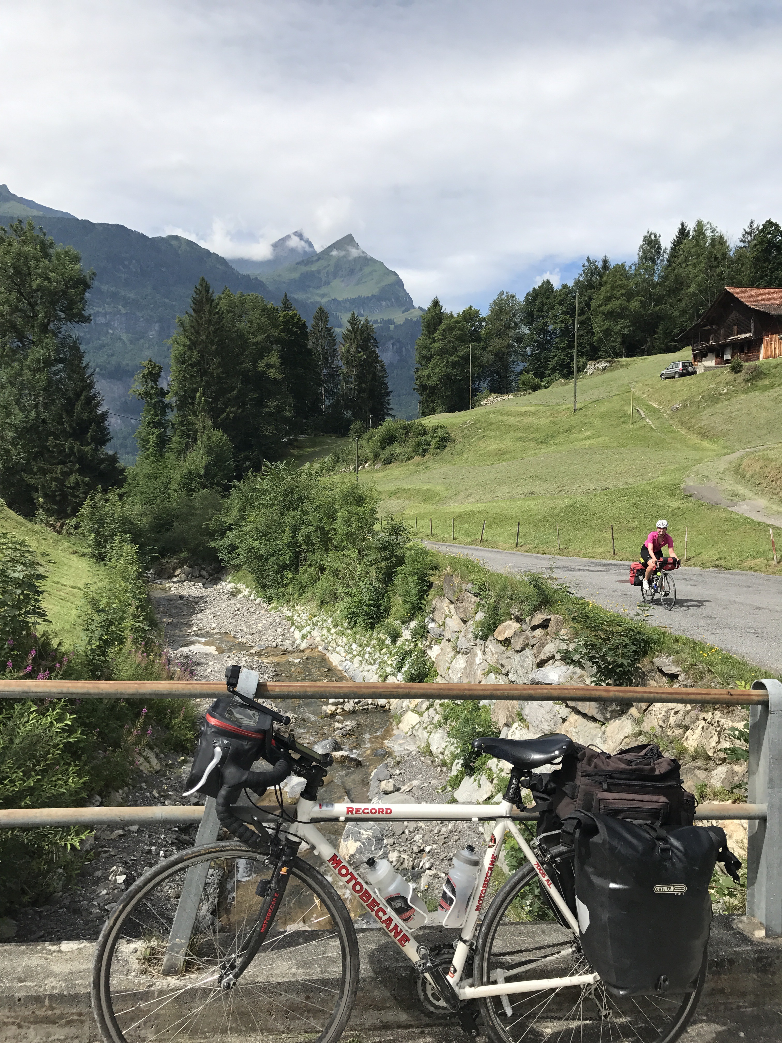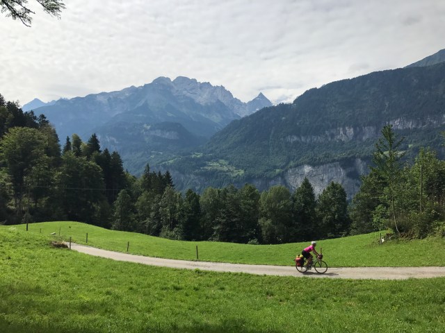 We got second breakfast in Meiringen and headed up a very gravely mountain pass. We were rewarded with high alpine meadows and excellent views of a glaciers in the high Alps. The downhill was crazy! Caitlin’s rim got so hot from braking that it blew out the tube. But thankfully she was coming to a stop when it happened, and we could see a cafe and walked it in to fix during lunch.